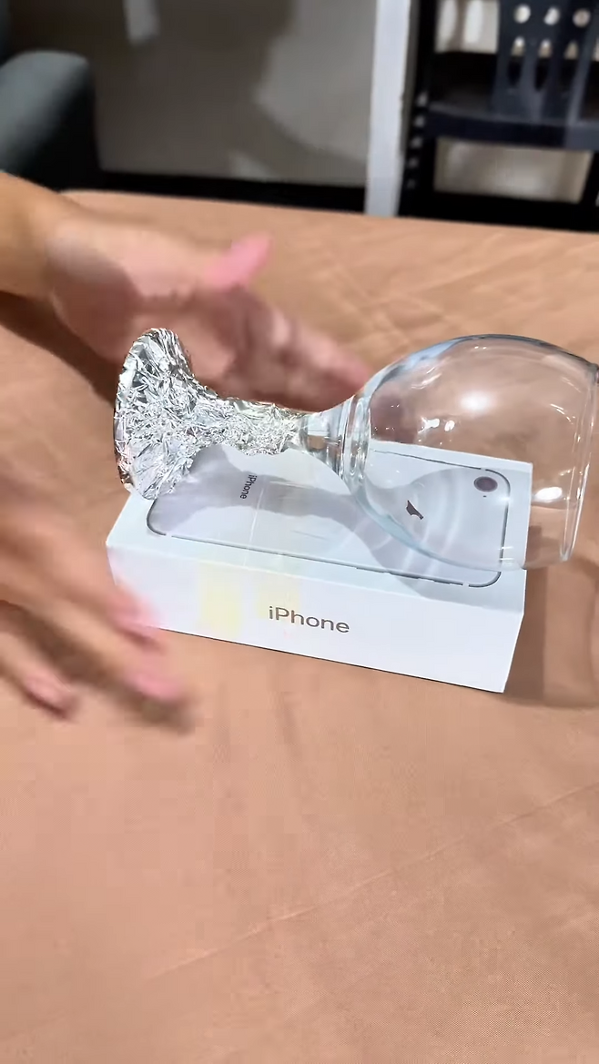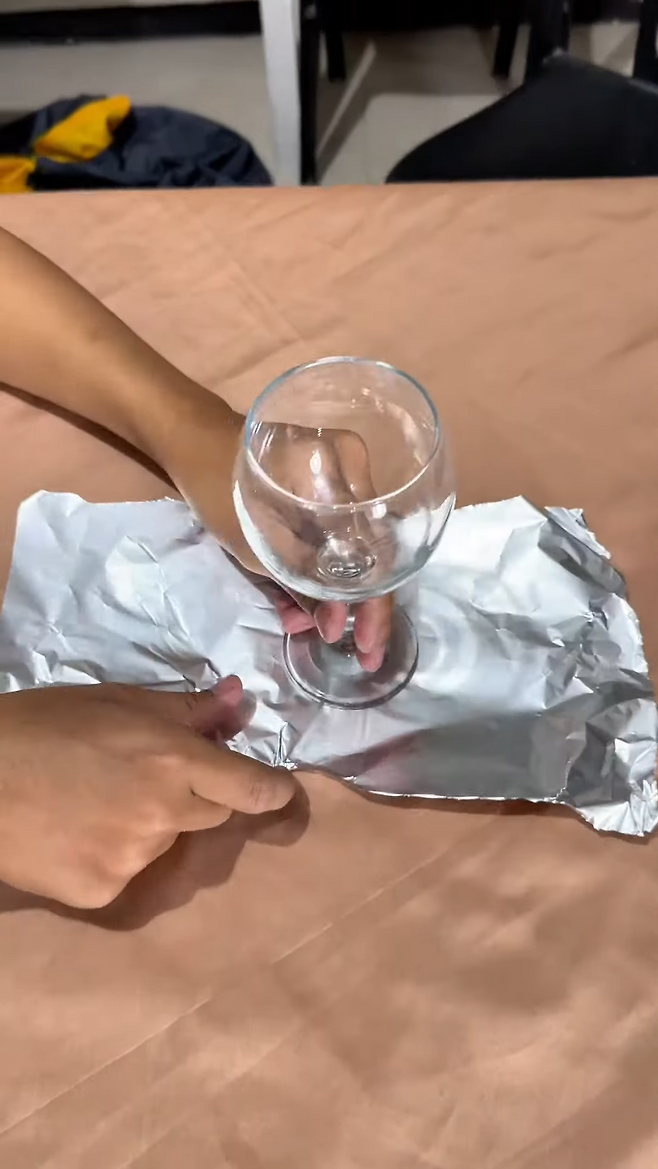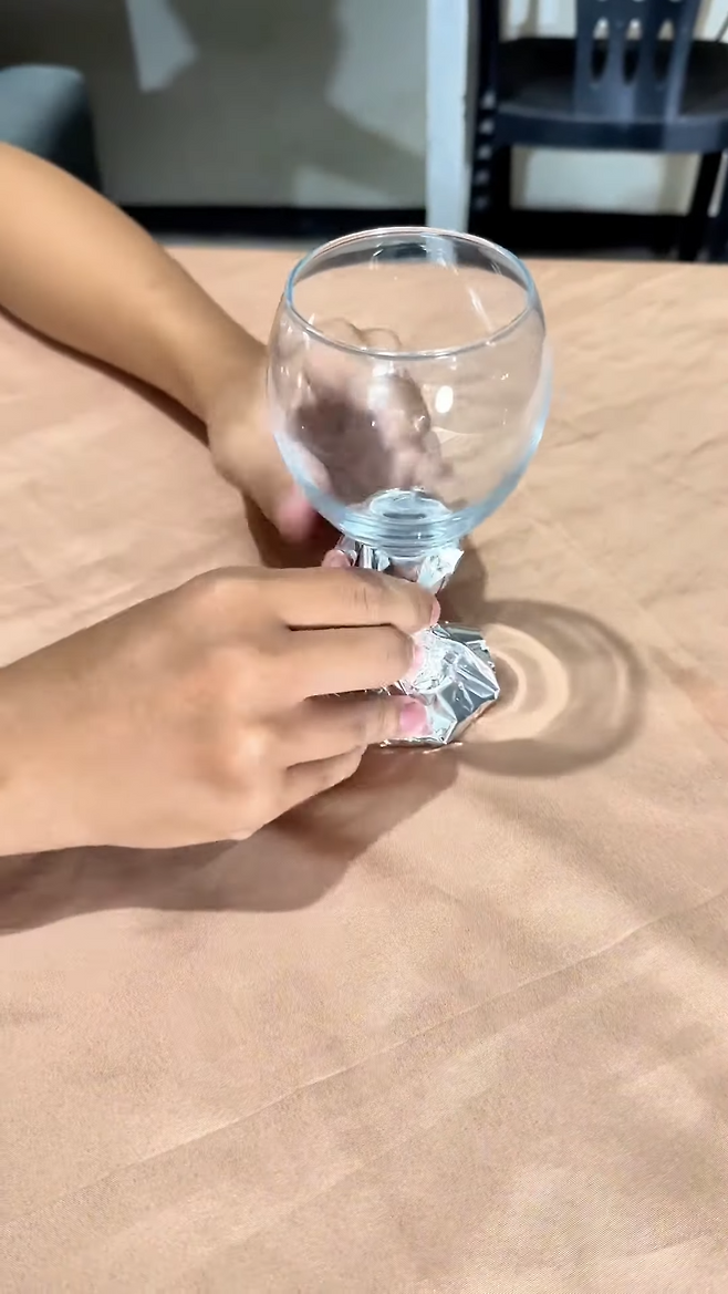 2. 와인잔의 기둥 부분을 알루미늄 호일로 감싸 단단하게 고정합니다.