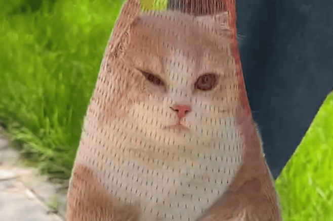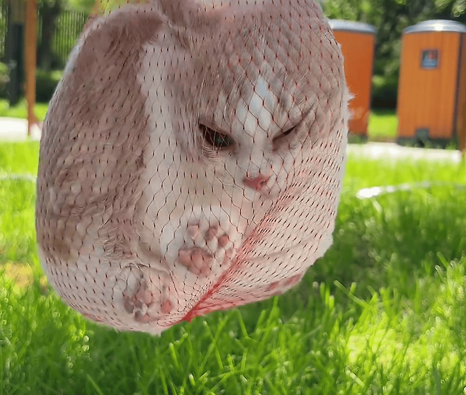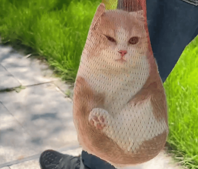 아마도 이들의 귀가 장면은 지나가던 사람들의 시선을 사로잡았을 것입니다. 망사 주머니 속 고양이들은 자신들의 우스꽝스러운 모습을 전혀 인지하지 못한 채 멍하니 바깥을 바라보고 있었습니다. 남성은 혹시 모를 사고에 대비해 조심스럽게 걸음을 내디뎠습니다.