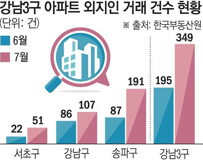 4일 한국부동산원이 발표한 월별 매입자 거주지별 아파트 매매 통계에 따르면 올해 7월 강남3구에서 외지인(관할시도외-기타)의 아파트 매수는 총 349건으로 전달인 6월(195건)보다 79% 증가했다.