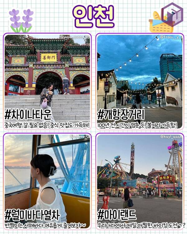 6월과 같이 걷기 좋은 날씨에 추천하는 국내 여행지 인천입니다. 차이나타운에서 마이랜드까지 모두 도보 또는 대중교통을 이용한 이동이 용이하기 때문에 뚜벅이 여행객들에게도 추천하는 6월 국내여행지인데요.