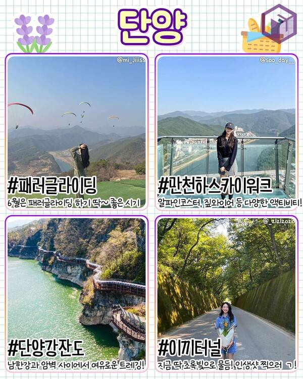 관광지 간 거리가 가까워 6월 당일치기 국내 여행지로도 추천하는 단양입니다. 단양에서는 패러글라이딩 체험을 빼놓을 수 없는데요. 대부분의 패러글라이딩 업체에서 픽업 서비스를 제공하고 있어 뚜벅이 여행객들도 무리없이 여행하기 좋은 6월 국내 여행지입니다.