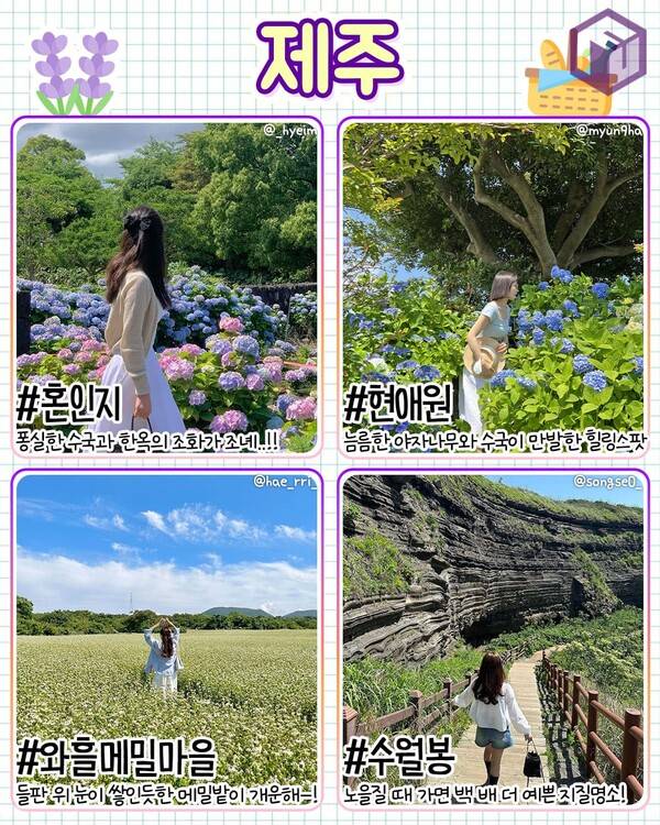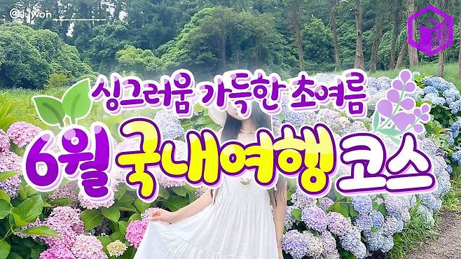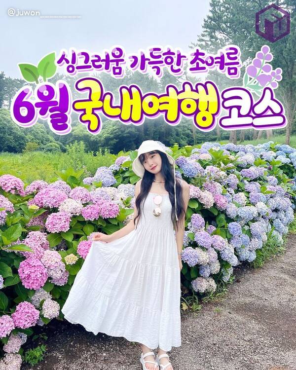 육지보다 한 발 자국 먼저 여름을 맞이하는 제주도 역시 6월 가볼만한 국내 여행지로 추천하는데요. 제주는 벌써 곳곳에서 퐁실한 수국이 활짝 피고 있습니다. 혼인 신화가 전해오는 연못 '혼인지'는 수국이 만발하면 제주도 특유의 전통 한옥과 정원의 조화가 더욱 아름다운 풍경을 선사해줍니다.