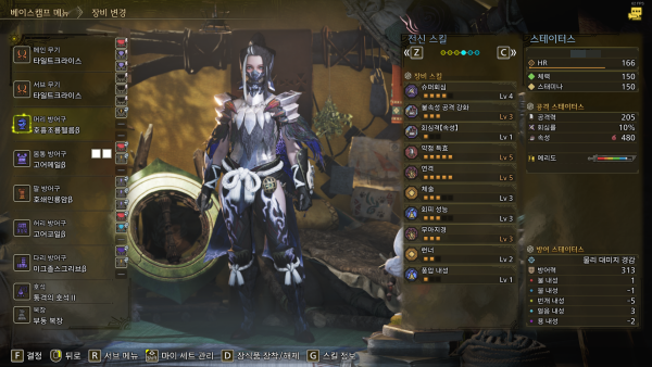 유틸 스킬은 활에게 필수인 체술 5레벨과 스태미나 급속 회복 3레벨을 채용했다. 추가적인 딜링 스킬로 연격을 추가해 공격력 및 속성치를 상승시키는 방향으로 세팅했다.