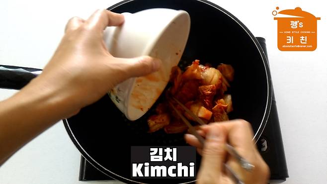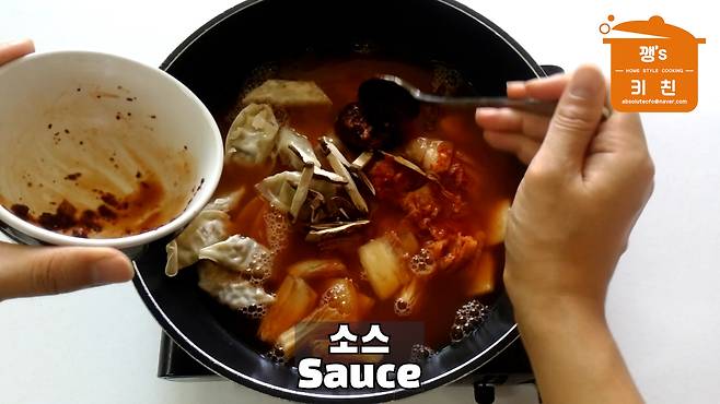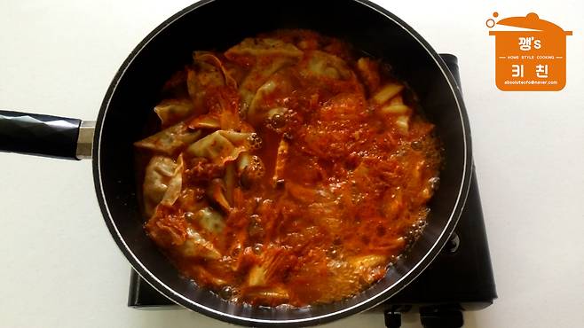 냄비에 김치와 만두를 넣고