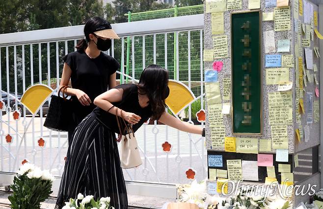 | ▲ 시민들이 20일 오전 서울 서초구 S초등학교 앞에서 1학년 교사의 극단적 선택에 가슴 아파하며 국화꽃과 위로의 메시지를 놓고 가고 있다. |