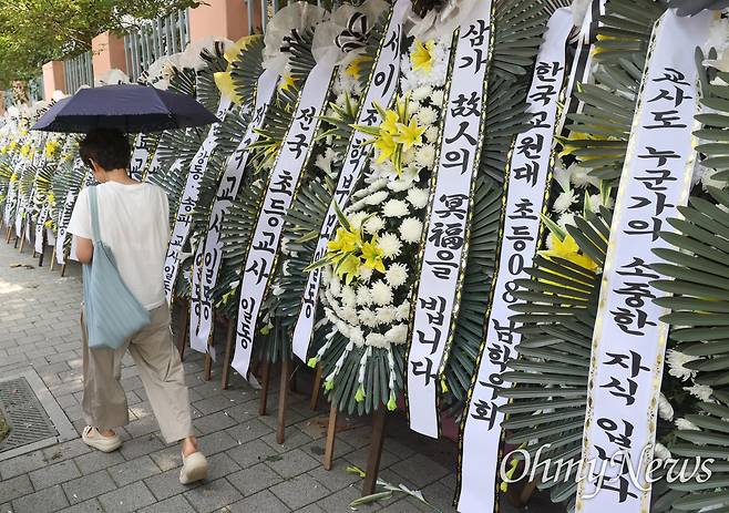 | ▲ 20일 오전 서울 서초구 S초등학교 앞에 전국의 교사들과 학부모들이 1학년 교사의 극단적 선택에 가슴 아파하며 근조화환을 보냈다. |