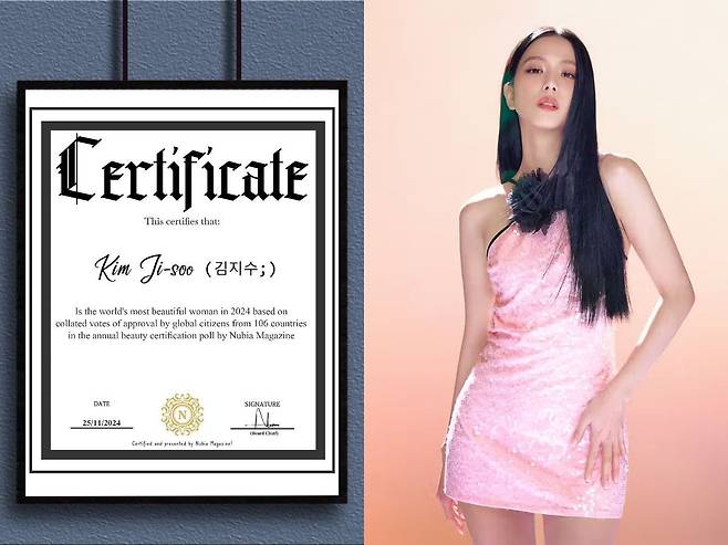 지수 측 관계자는 "영국 미디어 누비아 매거진(Nubia Magazine)에 따르면 전 세계 126개국 참가자, 90만 표 이상의 득표율로 진행된 투표에서 지수가 세계에서 가장 아름다운 여성으로 선정됐다"라고 밝혔습니다.