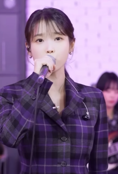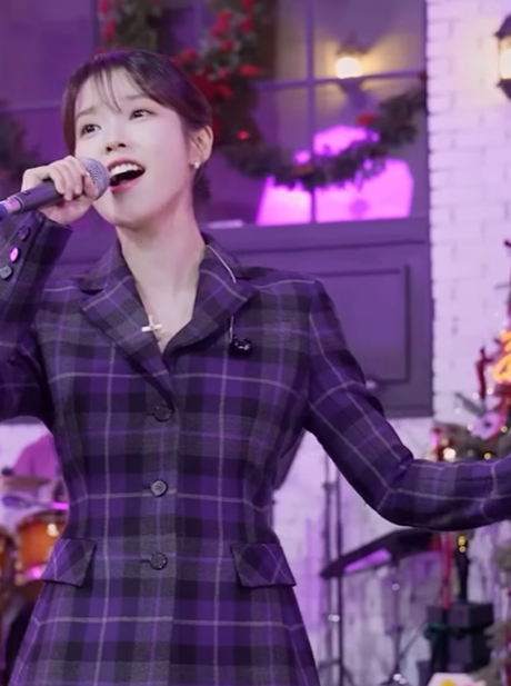 허리 라인을 잡아주는 핏 앤 플레어 스타일의 보라색 체크 자켓으로 클래식하면서도 세련된 감성으로 소화한 아이유. 각진 어깨라인의 디테일이 자켓 특유의 포멀한 느낌을 유지하면서도 보라색 컬러의 효과로 신비로운 이미지를 표현했다.