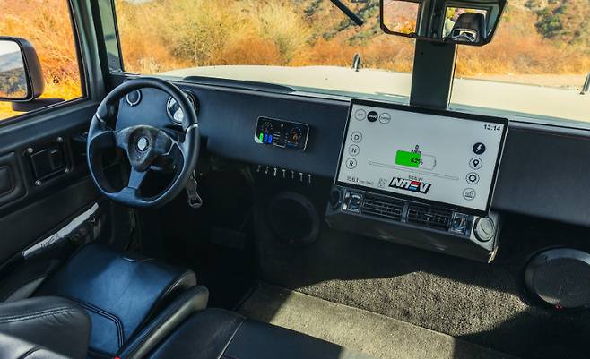 실내는 군용 차량 특유의 견고함을 유지하면서도, 고급 전기차에 걸맞은 첨단 요소를 가미했다. 대시보드에는 27인치 와이드 OLED 디스플레이가 장착되어 있으며, 스티어링 휠은 항공기 스타일의 조종간 형태다. 좌석은 가죽과 알칸타라 소재로 마감되었으며, 냉온 조절, 마사지 기능, 음성 명령 기반 조작이 모두 가능하다.
