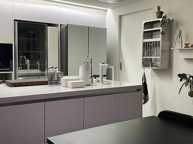 가전의 포인트는 술을 좋아하는 우리답게 커다란 스메그 와인 셀러와 (평생 함께할 친구..) 깔끔하고 매트한 무광 컬러를 넣은 삼성 키친핏 냉장고에요! 가전은 한가지 브랜드로 맞추는 게 편하다고 들어서 냉장고, 세탁기 같은 큰 가전들은 삼성으로 구입했습니다:) 어플에 연결해서 온도 맞추기나 예약 기능 등등 한 번에 사용 할 수 있어서 편리해요!