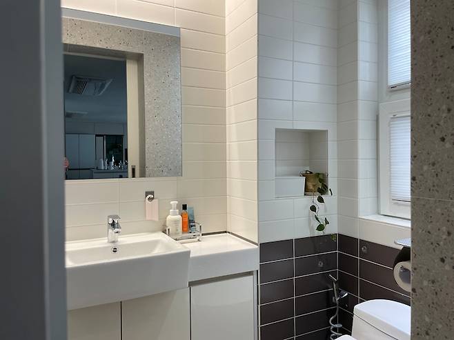 이 거울도 셀프로 벽에 달았는데, 도자기에 엄청 무거워서 남편이 드릴 박는 동안 온 힘을 다해서 제가 들고 있었답니다... 셀프 인테리어 할 때 저희끼리 자주 하는 말이 있어요. 이 없으면 잇몸으로 한다고...ㅎㅎ 그런 각오(?)로 어찌어찌 둘이서 이것저것 잘 설치했어요.