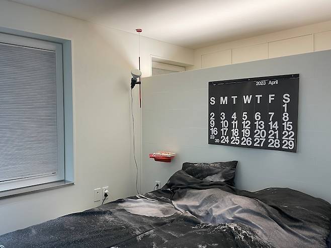 안방 벽도 원래는 TV가 있었는데 없애고 선반을 달아서 사진과 소품을 두었어요! 선반도 셀프, 조명도 전기 선을 건드리지 않는 건 다 셀프로 한 것 같아요. ㅎㅎ 이불이 볼록한 건 둘째 쏘니가 이불속에서 잠을 자기 때문이에요...ㅎㅎ 작은 귀여움 포인트!