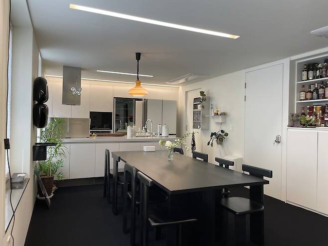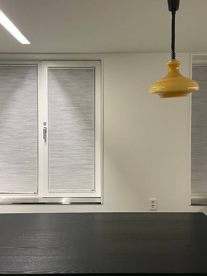 공간을 층수로 나눈 이 집의 특성상, 2층은 역할이 많은 공간이에요. 저희가 가장 많은 시간을 보내는 거실이면서, 다이닝룸이기도 하고, 스튜디오처럼 카페처럼 사용하고 싶어서 소파를 두지 않고 조명과 큰 테이블에 포인트를 주었어요! 왠지 꼭 있어야 하는 가구 중 하나가 소파일거라 생각했는데, 현재까지는 소파 없이도 만족스럽게 잘 사용하고 있어요