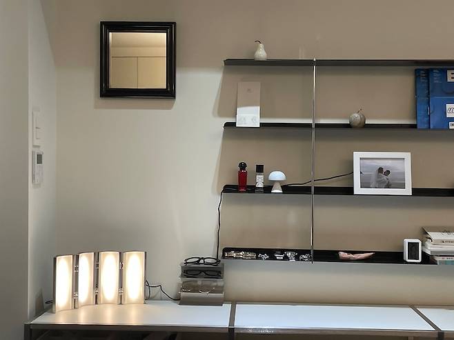 선반에는 안경이나 남편의 시계, 액세서리들과 책, 사진 등등 여러 가지를 올려두었어요! TV 없는 삶도 나쁘진 않답니다. ㅎㅎ 침실도 뭔가 더 분위기 있어지는 거 같아서 좋아요!