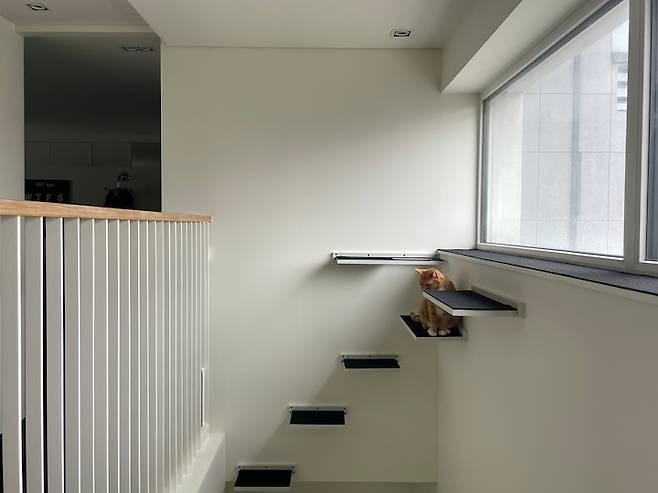 계단을 올라가면 넓은 위쪽 벽이 있어서 난간을 잘라 고양이 통로를 만들고, 인터넷으로 선반을 주문해서 셀프로 냥 선반을 시공했어요! 고양이는 수직 공간이 중요하기 때문에, 최대한 아이들에게 올라갈 곳을 많이 만들어 주고 싶었습니다:) 이렇게 셀프로 할 일들도 많다 보니 사다리나 드릴은 필수템...!