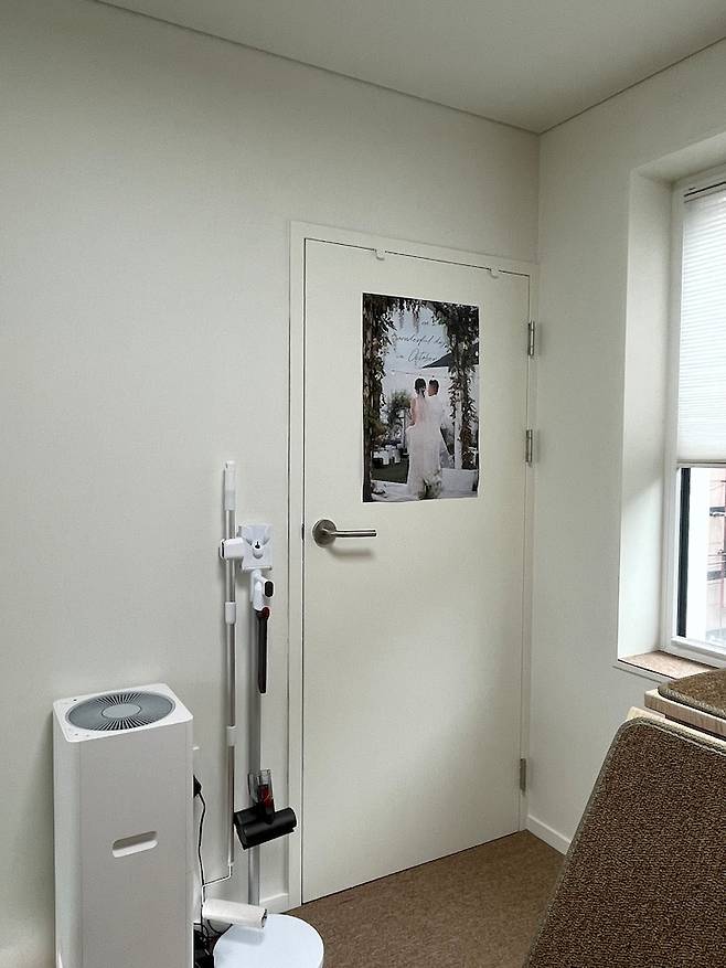 2층에 새로 단 문을 열면 여기서부터는 고양이들의 공간이에요! 안방도 3층에 있기 때문에 뭔가 우리 사진도 있어야 할 것 같아서(?) 결혼식 때 찍은 사진을 심플하게 300mm*300mm 사이즈의 개인 사진으로 만들어서 바닥에 두었어요! 둘째 쏘니 사진도 얼른 해줘야하는데... 서운해하겠네요.