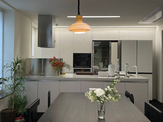 거실에서 주방을 바라본 모습이에요. 거실에 큰 다이닝 가구를 두었더니, 거실과 주방의 구분이 딱히 없어 보이기도 하네요. ^^;