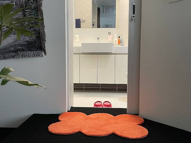 손님들이 주로 사용할 2층 화장실 겸 욕실이라 깔끔하게 꼭 필요한 것들만 두고 붉은 계열로 욕실화, 러그를 배치했어요.
