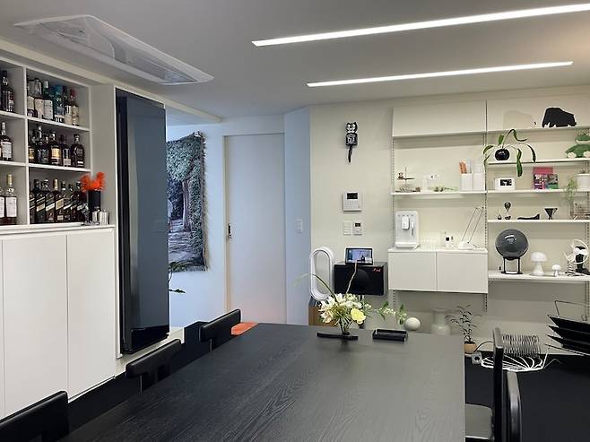 장을 짜서 공간을 분리하고 나니, 집의 키 포인트가 되었어요! 술테리어 괜찮나요?ㅎㅎㅎ 이전에는 넓어 보이고 이용하기 편하겠지만 겨울에 너무 춥고 반려묘들과의 공간 분리를 위해 에어드레서장+위스키장+문을 설치 했더니 수납공간도 생기고 공간 분리도 되고 보온까지 되는 1석 3조!