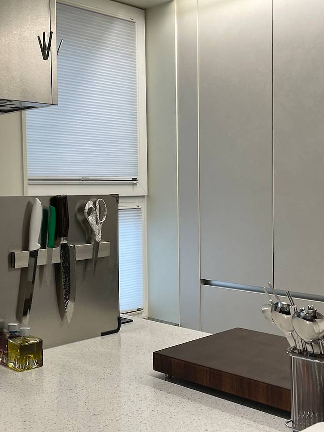 소소하게 잘산템은 스테인리스 가림막과 칼, 가위를 붙일 수 있는 자석이에요! 칼이나 가위는 꽂아두는 것도 좋지만 이렇게 붙여두니 편하더라구요?! 디자인에 반해서 구입한 이딸라 가위도 잘 들어서 너무 좋아하는 아이템이에요 :)