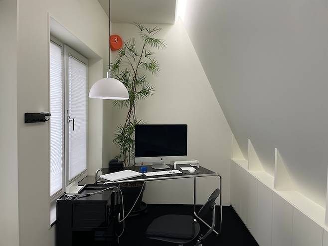 아이들이 좋아하는 창가를 지나 문을 열면 남편이 서재로 쓰고 있는 공간이 나와요! 프리랜서인 남편은 혼자 집중해서 일할 공간이 필요한데, 사선으로 기울어져 있는 다락방의 형태라 딱 심플하고 집중이 잘 되는 느낌으로 꾸며보았어요.