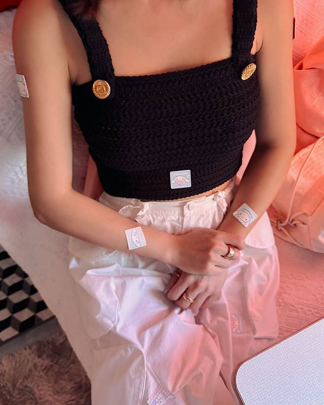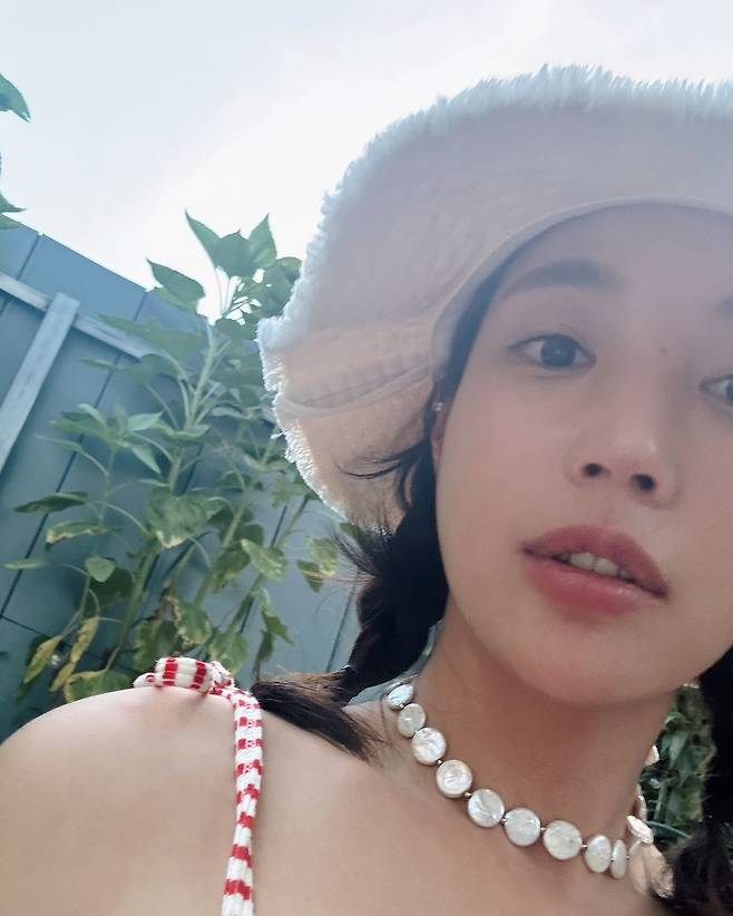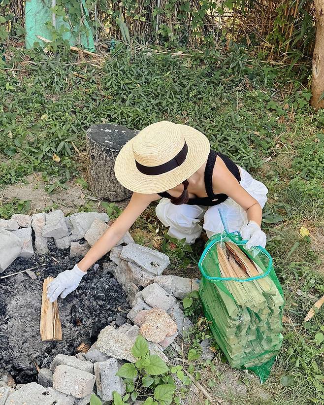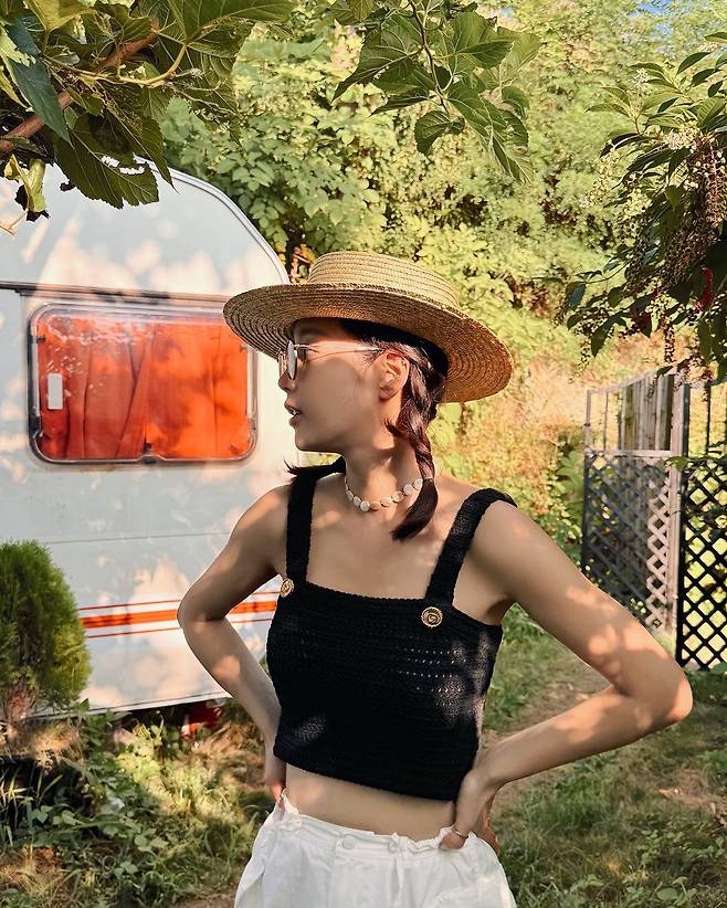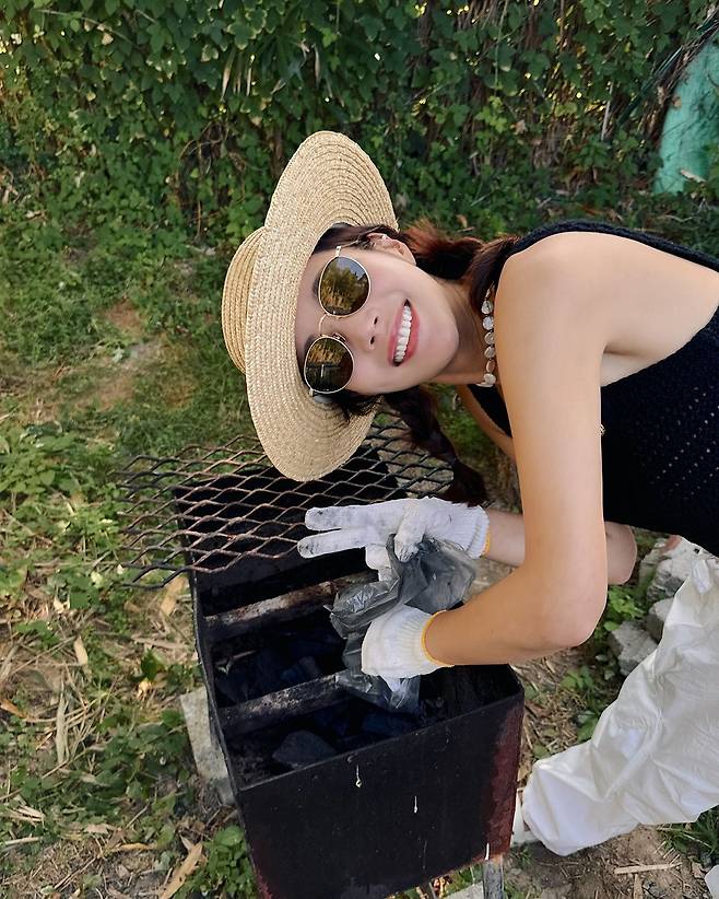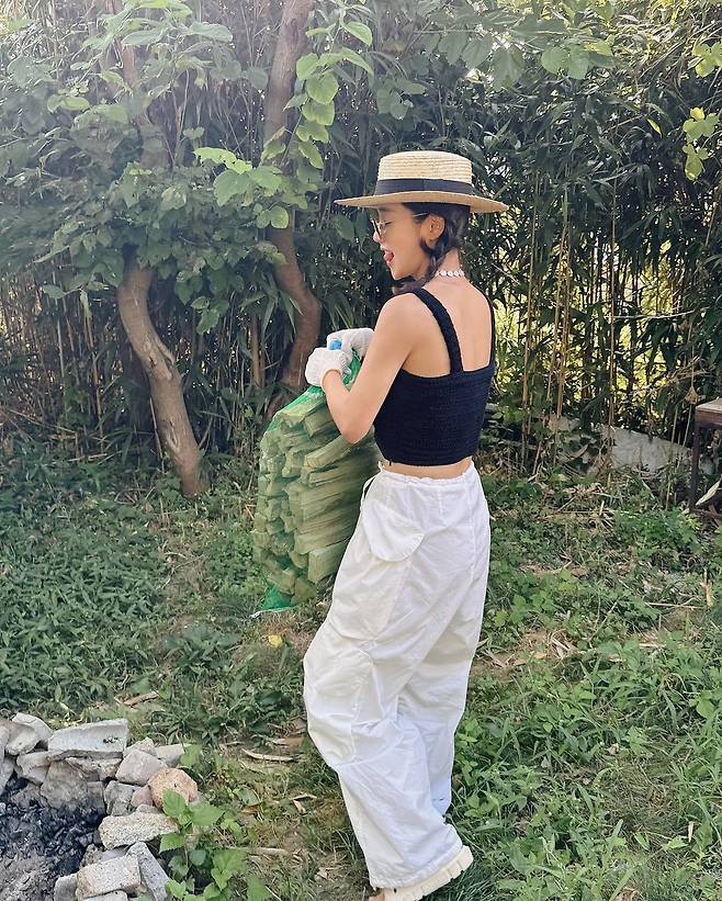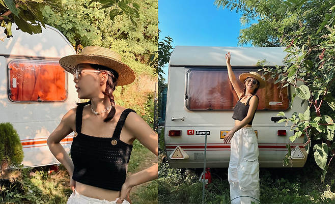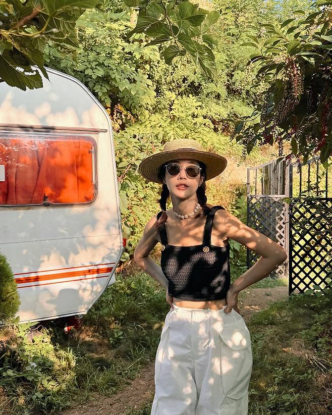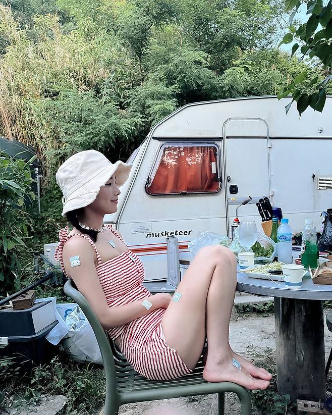 사진 속 기은세는 블랙 크롭 민소매티를 입고 흰 카고 팬츠와 모자를 써서 캠핑룩을 선보였다. 또 다른 사진에서는 빨간 스트라이프 셋업과 흰 티와 스트라이프 팬츠를 입고 남다른 패션 감각을 선보였다.