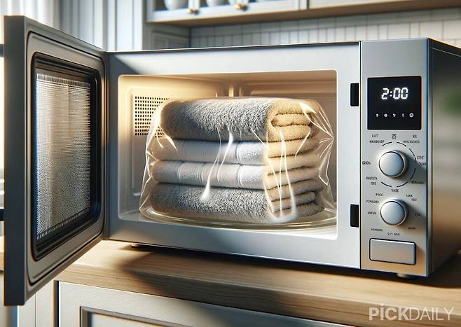 먼저 수건을 물에 적셔준다. 그다음 물기를 적당히 짜준 뒤 돌돌 말아 비닐봉지에 넣어준다. 비닐봉지 입구를 묶거나 접어 준 뒤 전자레인지에 넣고 2~3분을 돌려준다.