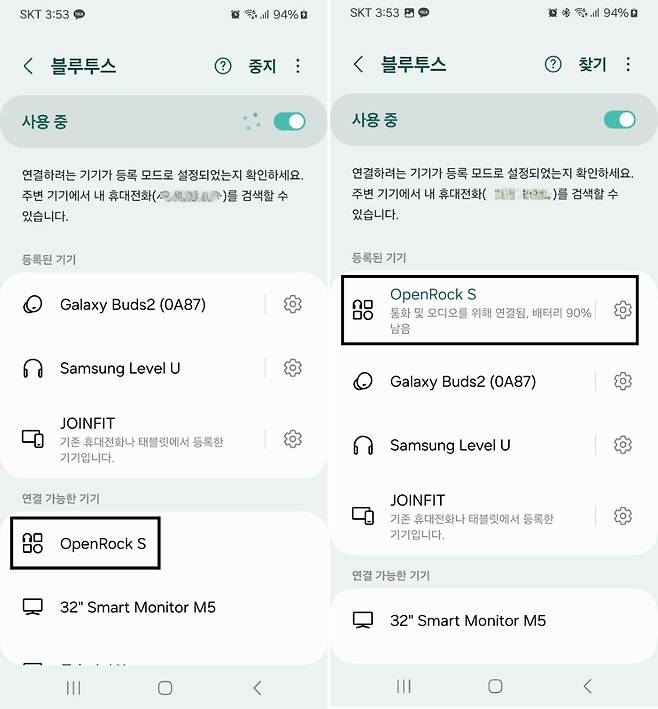 OpenRock S를 사용하려면 먼저 스마트폰 등 기기와 블루투스로 연결해야 합니다. 충전 케이스를 열고 이어폰에 부착되어 있는 비닐을 제거한 후 충전 케이스를 다시 닫은 다음 10초간 기다립니다. 충전 케이스를 열면 이어폰의 표시등이 깜박거리고 페어링 모드로 들어갑니다. 연결할 기기에서 OpenRock S를 선택하면 연결이 완료됩니다.