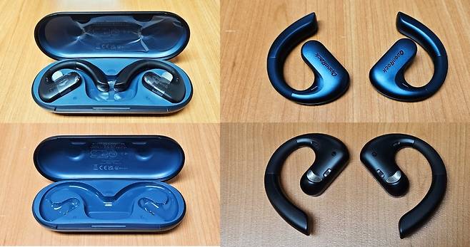 충전 케이스를 열면 이어폰이 나오고 비닐을 벗긴 후 사용하면 됩니다. 이어폰은 양쪽 귀에 거는 훅 타입입니다.