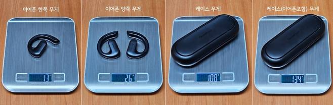 이어폰과 충전 케이스의 무게를 재봤습니다. 이어폰 하나의 무게는 13g, 케이스 자체 무게는 108g입니다. 스펙상에는 12g으로 되어 있는데 저울 차이일 수도 있고 살짝 무게가 오차가 있습니다.