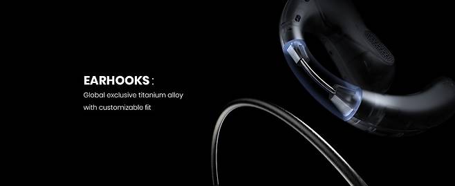 훅에는 티타늄 합금 와이어가 적용되어 사용자의 귀 형태에 맞춰 훅 모양을 조절할 수 있습니다. 훅의 위치를 조절하면 변경된 상태로 유지되어 개인의 귀 모양에 맞춰 편안하게 착용할 수 있습니다. 이어폰을 끼고 확인해 보니 나중에는 끼고 있다는 것을 잊어버릴 정도로 편안했습니다.