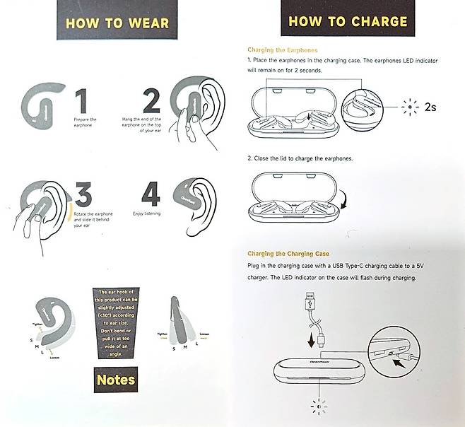 훅 타입의 이어폰은 처음 사용해 봐서 헤매다 퀵 가이드의 착용 방법을 보고 끝부분부터 돌려서 잘 착용했습니다. 설명서는 잘 읽어보는 게 좋을 것 같습니다.