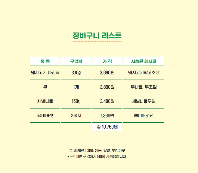 요즘같이 더운 날에는 장바구니가 가벼울 수록 좋죠. 그래서 오늘은 레시피에 들어간 재료가 가장 적습니다! 총 4가지로 만드는 5가지 레시피를 절대 놓치지마세요.