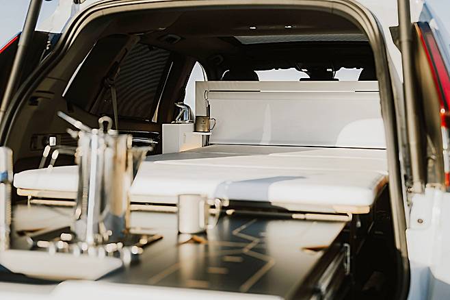 주방 유닛에는 접이식 싱크대, 2구 스토브, 식기 수납공간이 포함돼 있으며, 실외에서도 바로 사용할 수 있도록 설계돼 차박이나 외부 캠핑 시에도 활용도가 높다. 실내 천장에는 분위기를 더하는 조명과 맞춤형 커튼이 설치되어 있으며, 탈착형 배터리 시스템을 활용한 전기 장비도 연동이 가능하다. 실제 차량보다 더 ‘작은 집’에 가까운 구성을 지녔다.