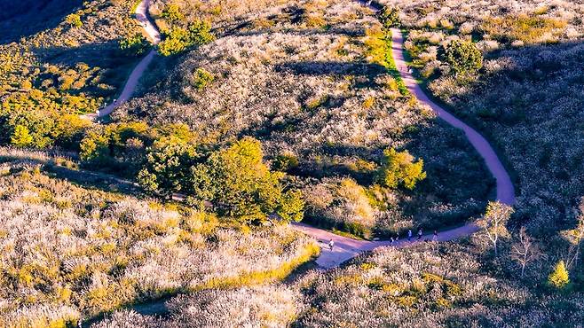정상 주차장에서 차를 세우고 단 5분만 걸으면 60만㎡의 억새평원이 파노라마처럼 펼쳐진다. 휠체어나 유모차도 진입 가능한 데크길도 잘 마련되어 있어, 남녀노소 모두가 걷기 좋다.