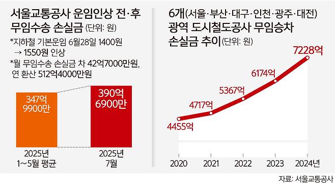 기본운임 오르며 적자폭 더 커져 서울교통公, 7월 한 달 391억 육박 전국 6개 도시철도 年 7000억 넘어 공사·지자체 “국비 지원을” 입장 국토부 등 손실 보전 요구에 난색