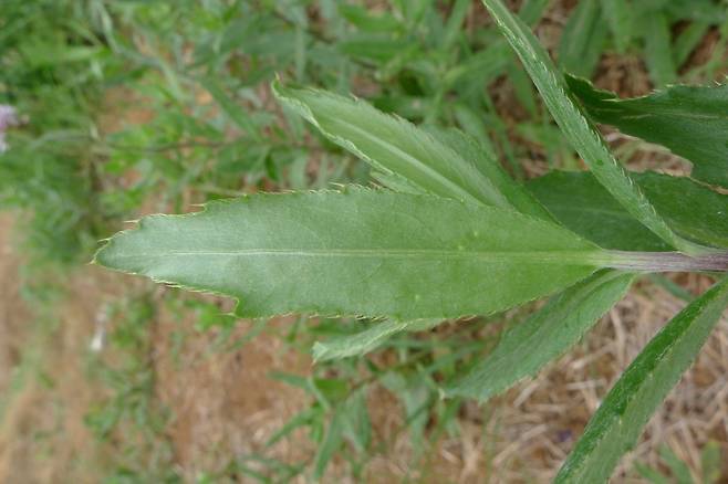 가지는 거의 갈라지지 않으며, 잎은 어긋난다. 이 잎은 긴 타원 형태를 하고 있고 끝이 둔하며, 가장자리에는 잔 톱니와 더불어 가시 같은 털이 있다. 줄기 위쪽으로 올라갈수록 잎자루가 없어지고 잎이 작아진다.