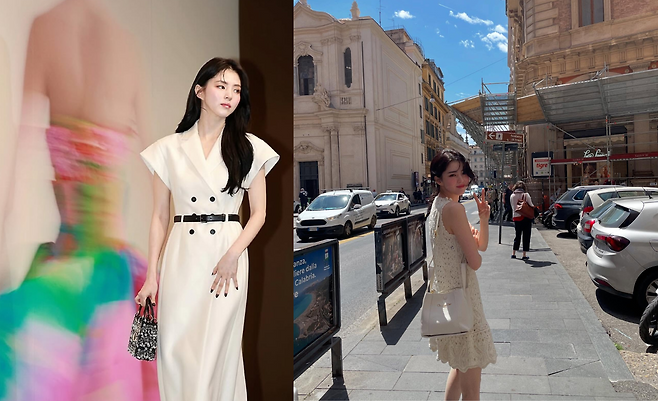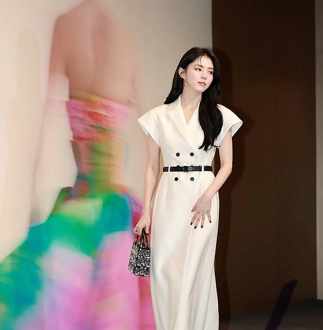두 번째 룩에서는 화이트 더블 브레스티드 원피스로 클래식한 우아함을 선보이고 있다. 검은 벨트로 허리 라인을 강조한 스타일링은 단정하면서도 세련된 느낌을 연출한다. 미니 체인백을 매치한 액세서리 선택도 전체적인 룩의 완성도를 높이고 있다.