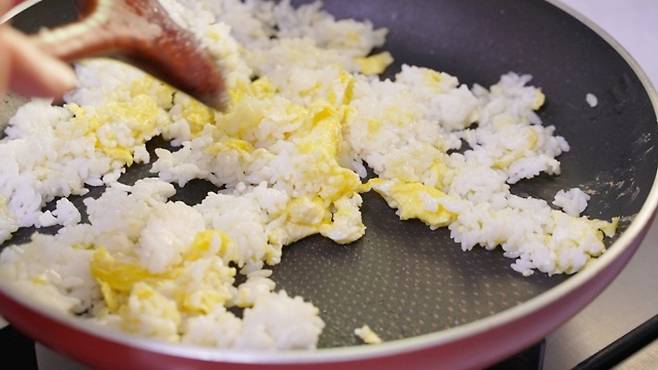 밥 한 공기를 넣고 계란과 함께 잘 볶아 주세요.