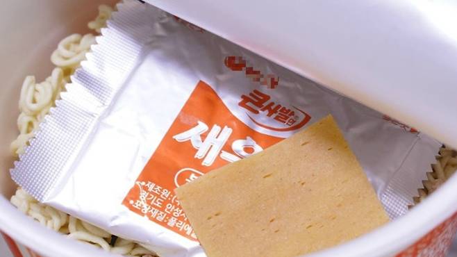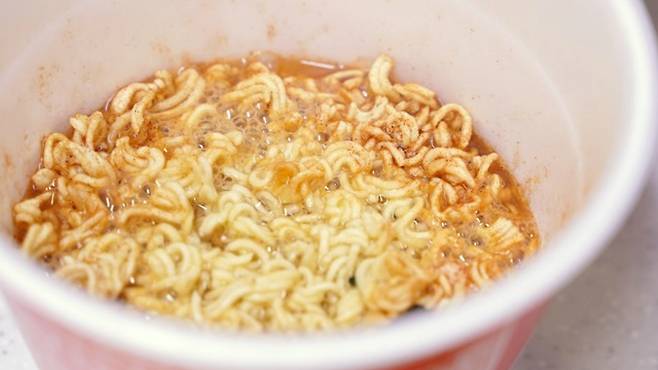 그리고 수프와 건더기 모두 컵용기에 넣은 후 물을 넣어 주세요. 이때 물은 컵 용기 기준선이 아닌! 라면이 잠길 정도로만 넣어 주는 것이 좋아요.