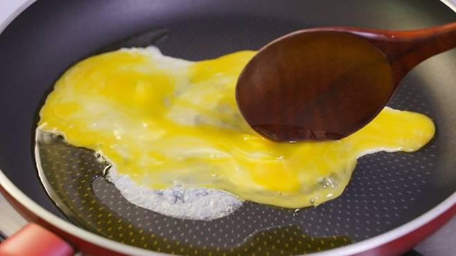 프라이팬에 식용유를 두르고, '중강불'에서 풀은 계란을 넣고 잘 저어 주세요.