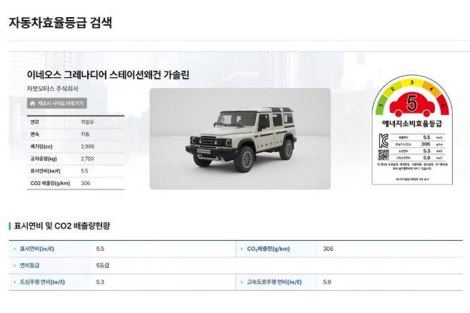 이번에 인증 받은 모델을 살펴보면, 이네오스 그레나디어 스테이션왜건 가솔린 모델로 도심 5.3km/l, 고속도로 5.9km/l 복합연비 5.5km/l이며, CO₂배출량 306g/km로 연비등급은 5등급을 받았다.