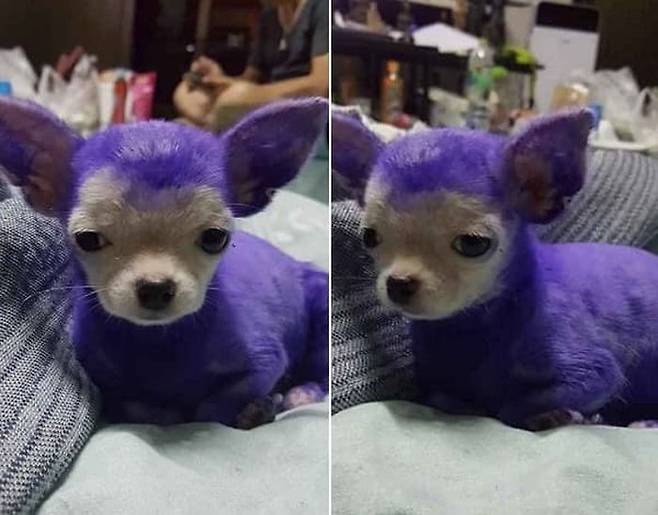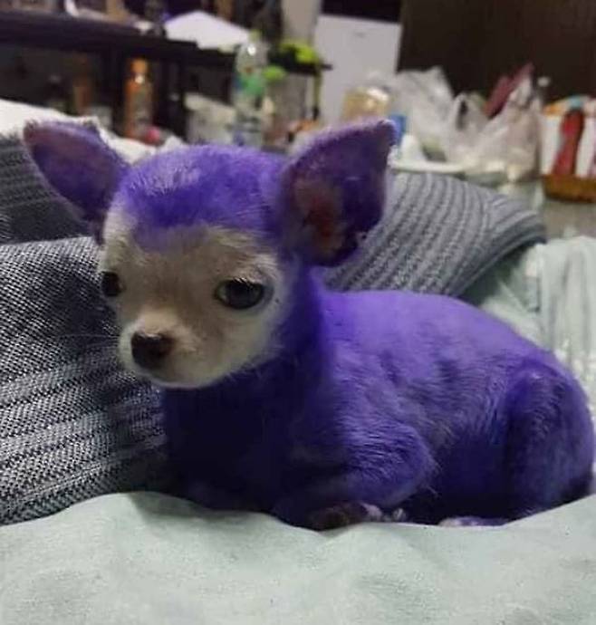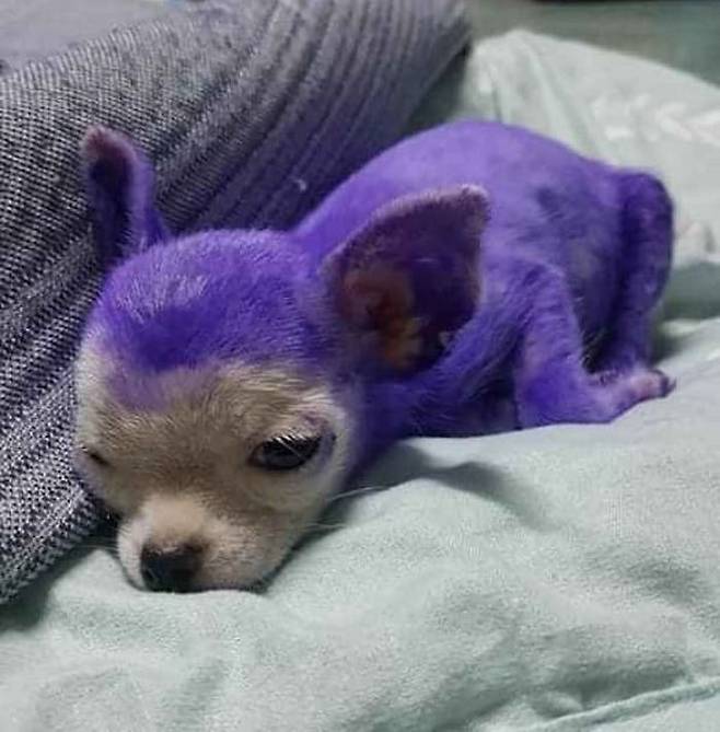 도대체 어쩌다가 강아지는 몸에 약을 발라 이렇게 보란색으로 물들게 된 것일까요. 어떻게 된 영문인지 궁금해도 너무 궁금합니다.