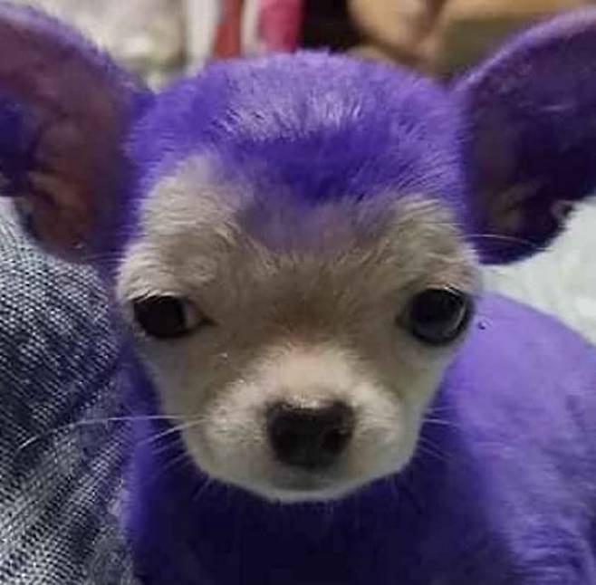 이 귀엽고 억울한 보라색 강아지의 사진은 많은 사람들의 웃음을 자아냈는데요.