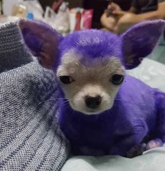 사진을 접한 사람들은 "처음에 누가 강아지 염색 학대한 줄 알고 화났는데, 사연을 읽으니 너무 귀엽다", "저 시무룩한 표정이 너무 웃기다", "보라색도 잘 어울리는 귀여운 강아지" 등의 반응을 보였습니다.