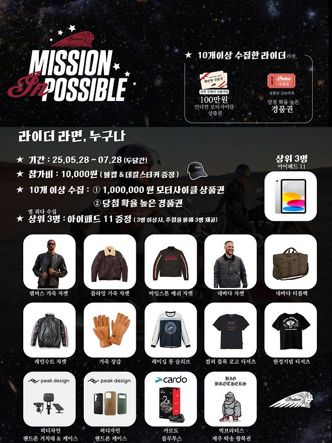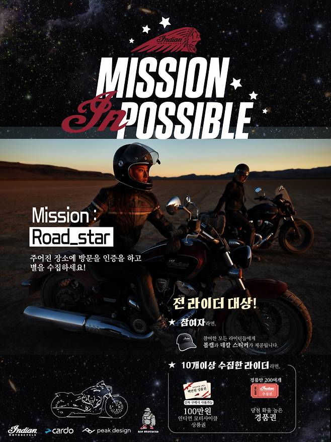인디언 모터사이클 코리아는 오는 8월 8일 15:00시, 미션 인파서블: 로드 스타(Mission In Possible: Road_star)의 럭키드로우를 진행한다고 밝혔다.