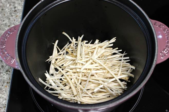 우엉은 공기에 접촉하면 금방 갈변되기 때문에 식촛물에 넣어두고 채썰면 좋아요.