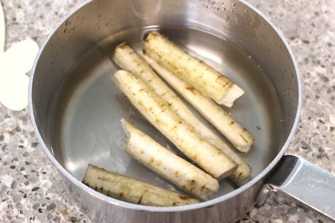 사실 색이 변해도 먹는 데에는 지장이 없지만 냄비밥에 넣을 것이기 때문에 시커멓게 변하면 담음새가 예쁘지 않으니까요.