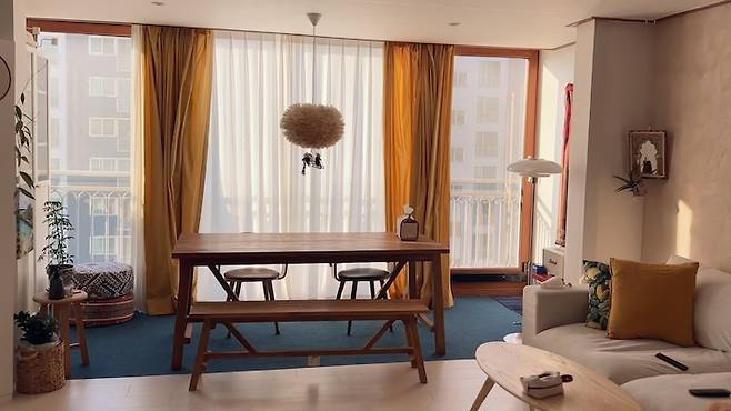 이 부분을 적당히 해결할 수 있는 방법을 궁리하다, 카펫 타일을 깔기로 했어요. 대신, 먼지가 덜 날리면서 예쁜 컬러로 .. 깔았어요. 카펫을 시공하니까, 발이 시리지도 않고 늘 포근해서 만족하며 사용한답니다. 다이닝 테이블을 이용할 때나 창문을 열고 닫을 때만 주로 이 공간에 오다 보니 때도 많이 타지도 않아요.