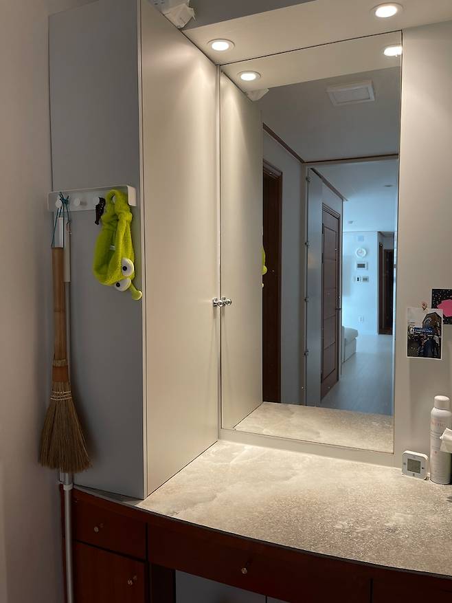 문을 열면 이렇게 화장대 공간이 나오고 ㅎ 이렇게 문이 열려있으면 복도가 아주 길어서 가끔 런웨이 워킹을 한다는 ( 속닥속닥…🤫 )